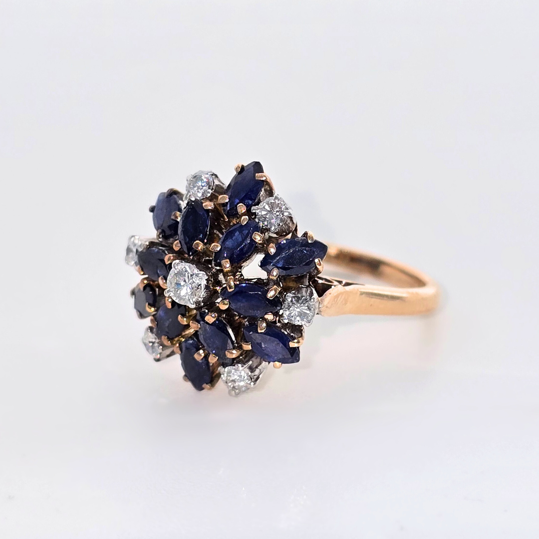 Experience the beauty of 14kt Rose Gold with this elegant fine jewellery piece, weighing approximately 5.4 grams and fully hallmarked with a UK Assay stamp. Designed in size EU 54.5 / UK N 1/2, the ring showcases seven natural round brilliant cut diamonds totalling 0.25 carats, paired with twelve vivid natural sapphires with a combined weight of 1 carat. The warm rose gold setting enhances the sparkle of the diamonds and the richness of the sapphires, creating a harmonious balance of colour and brilliance. Presented in new condition, this ring is the perfect choice for those who appreciate modern elegance with a touch of timeless luxury.
