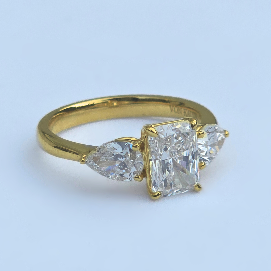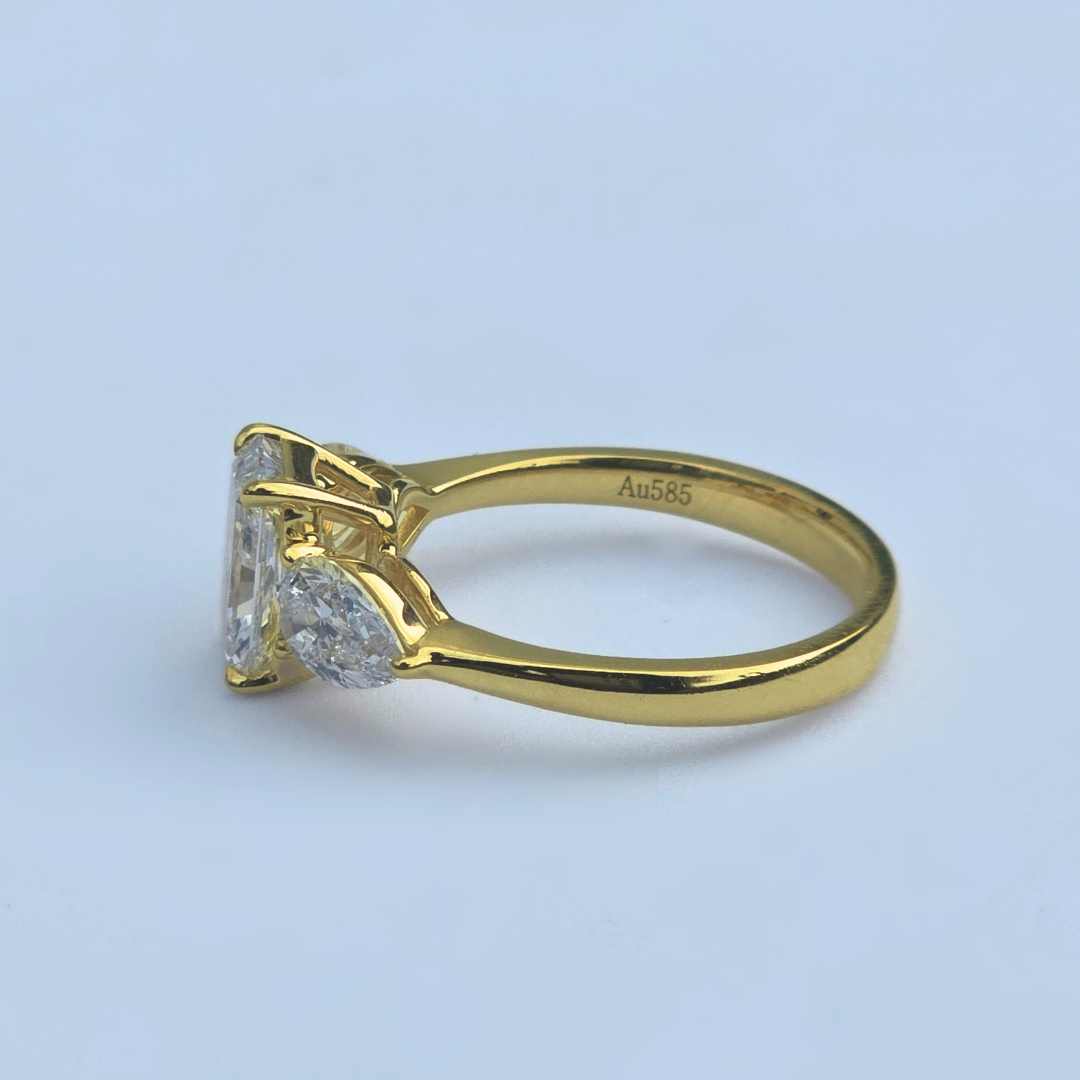 2.51cts Radiant Cut & Pear Cut Lab-Grown Diamond Trilogy Ring – 14ct Yellow Gold